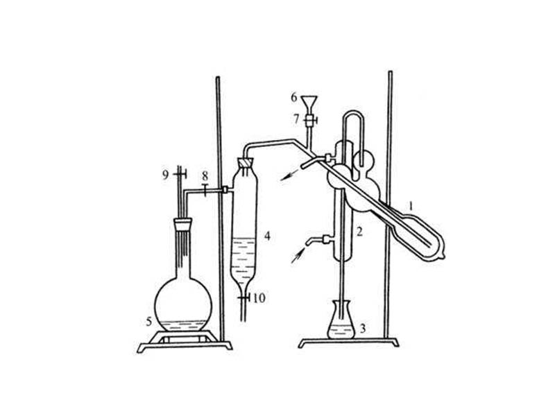 11) 向蒸餾瓶中加入濃堿時,往往出現褐色沉淀物,這是由于分解促進堿與加入的硫酸銅反應,生成氫氧化銅,經加熱后又分解生成氧化銅的沉淀。有時銅離子與氨作用,生成深l藍色的結合物[Cu(NH3)4]2+